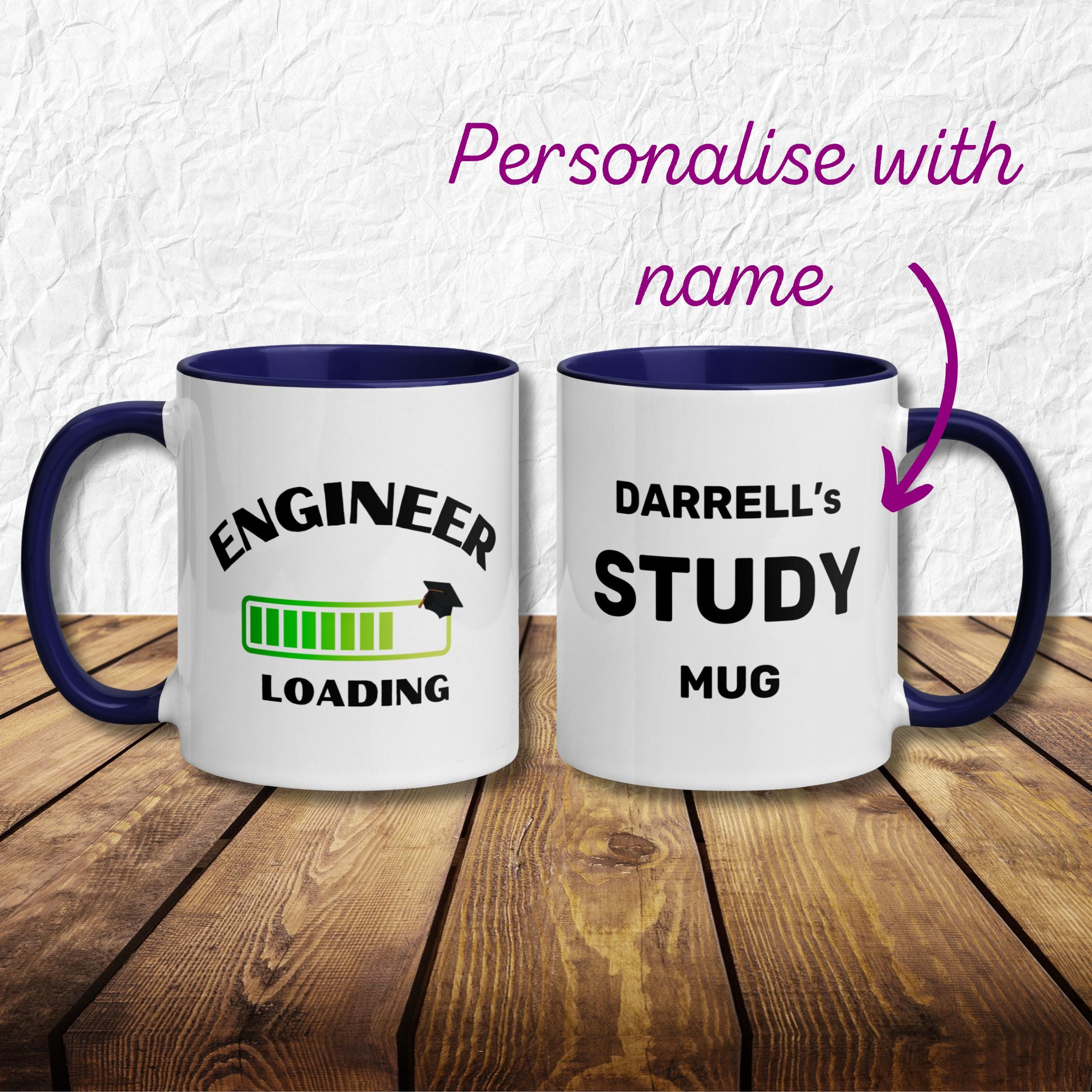 The mug can be personalised your students’ name on one side and with ‘engineer loading’ on the other side.