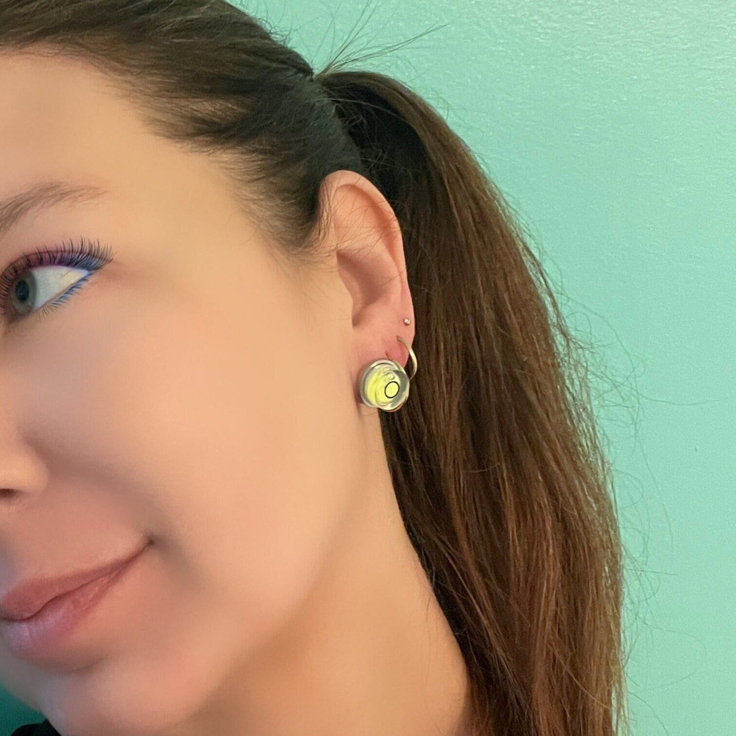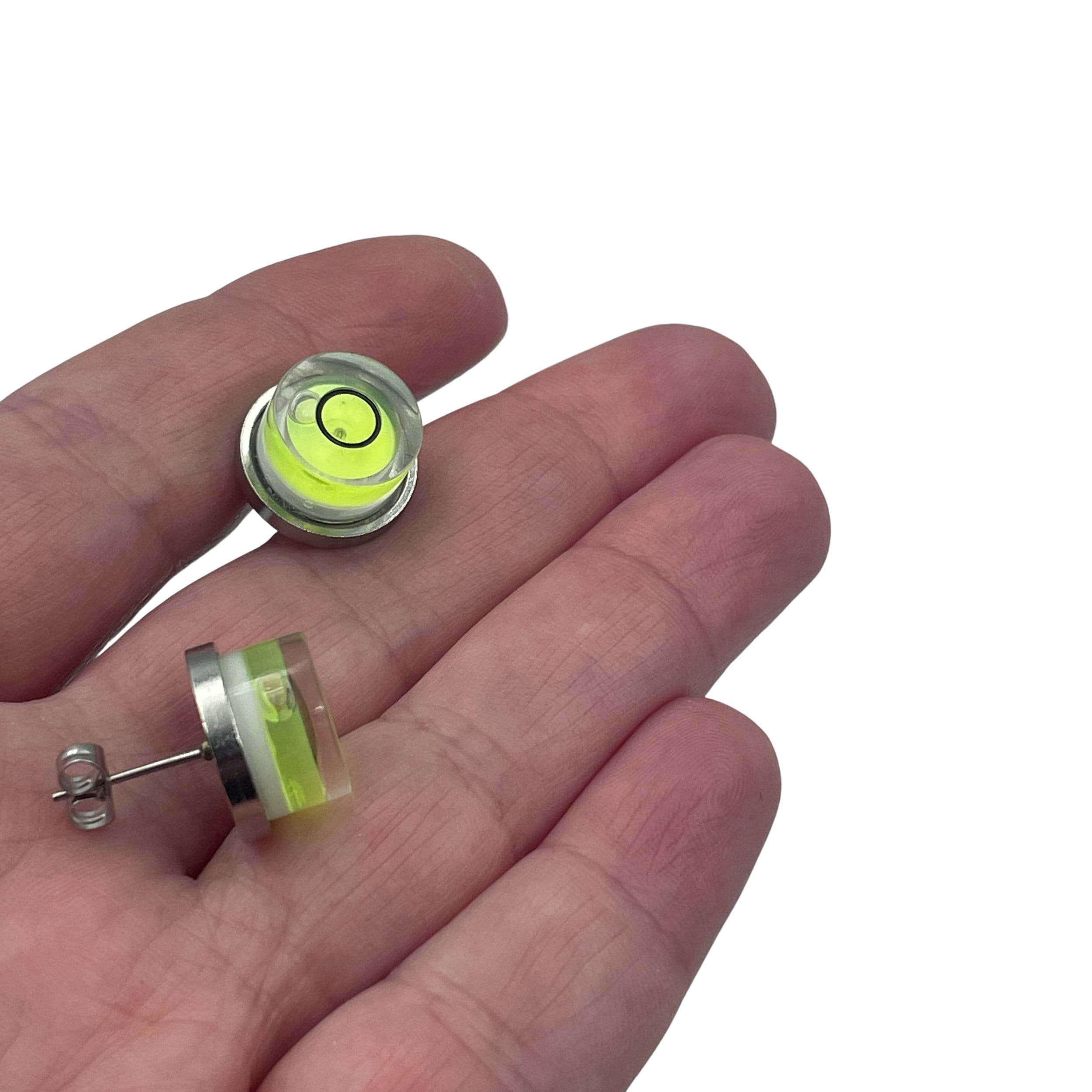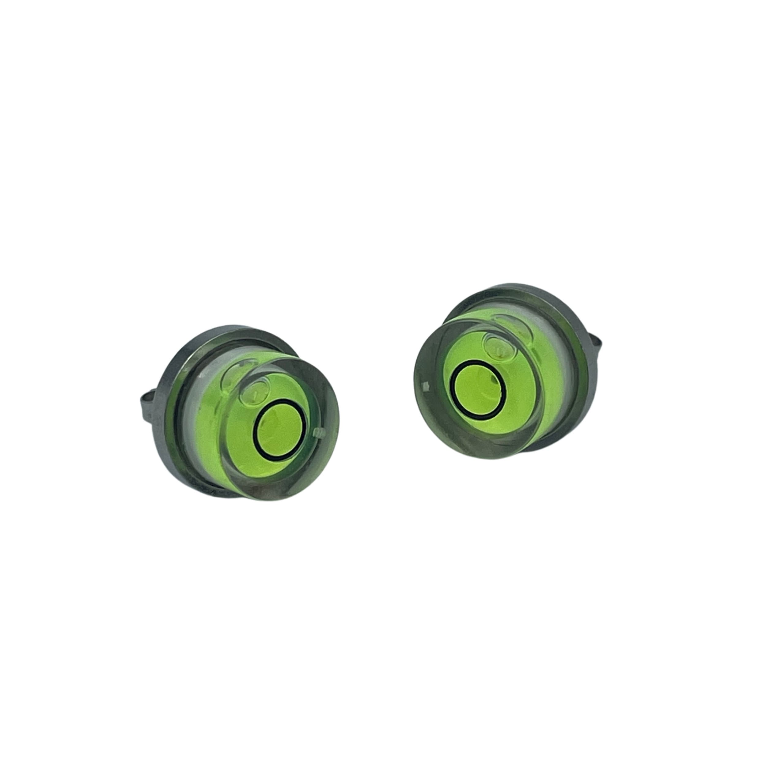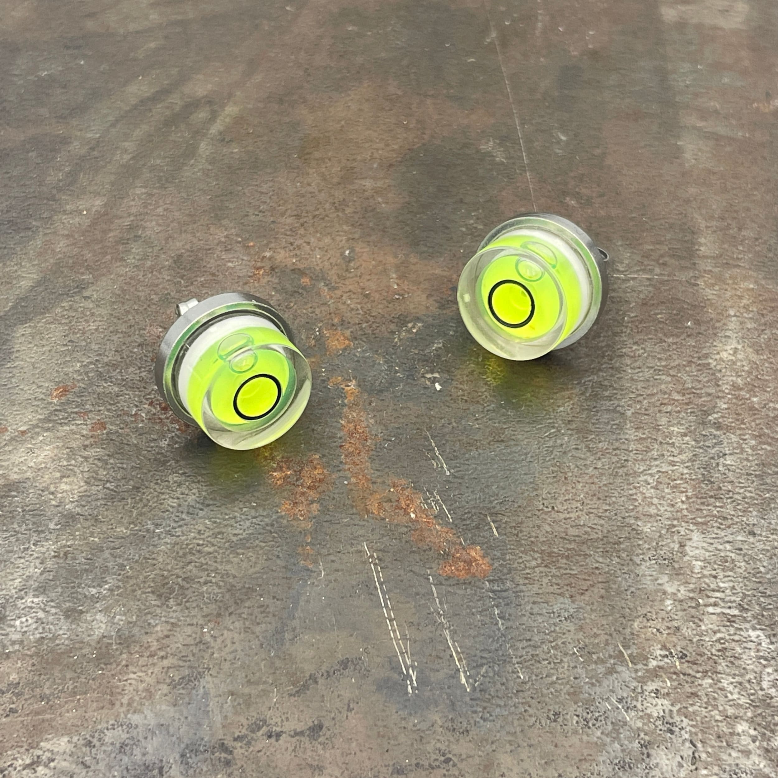 A unique statement stainless steel earring bezel, including a functioning round spirit level.
