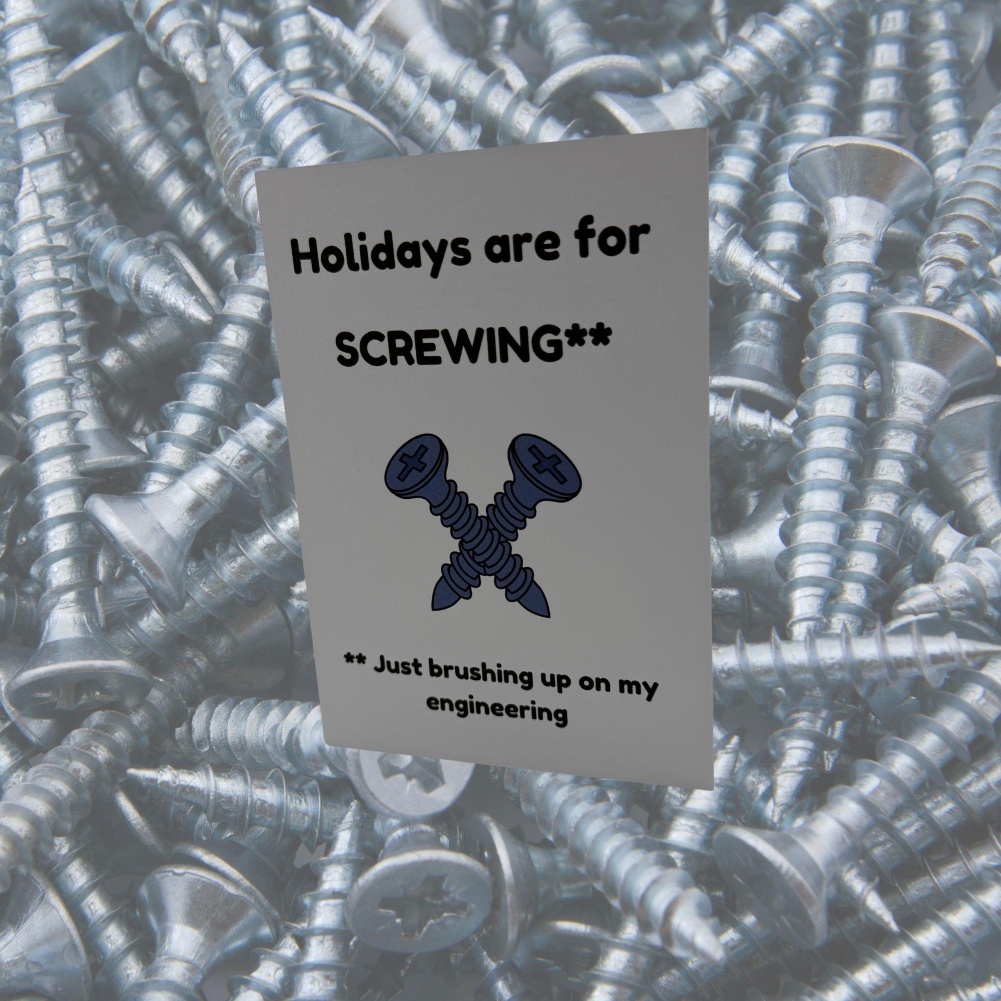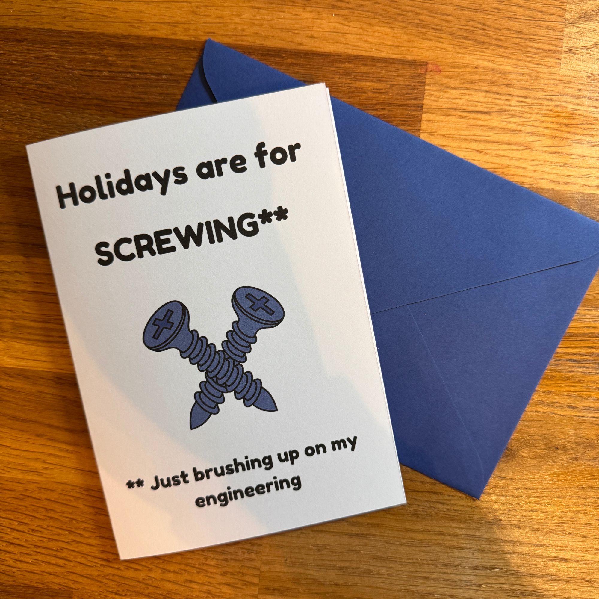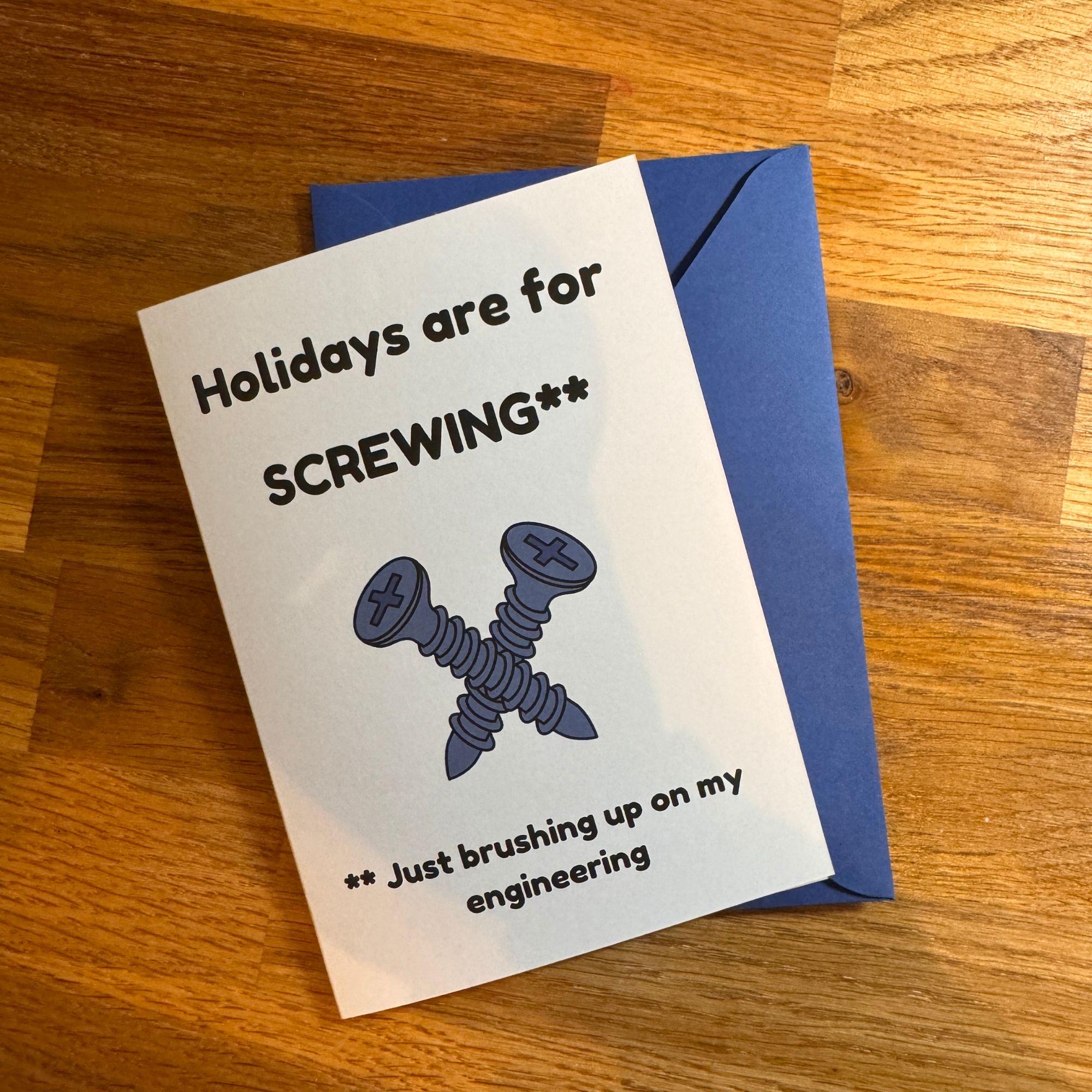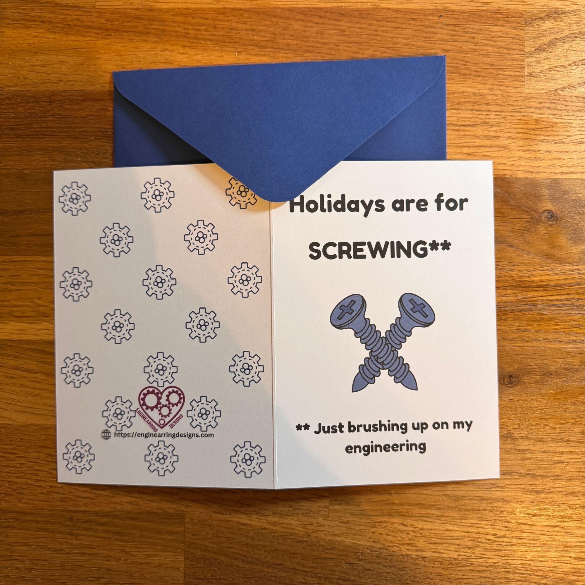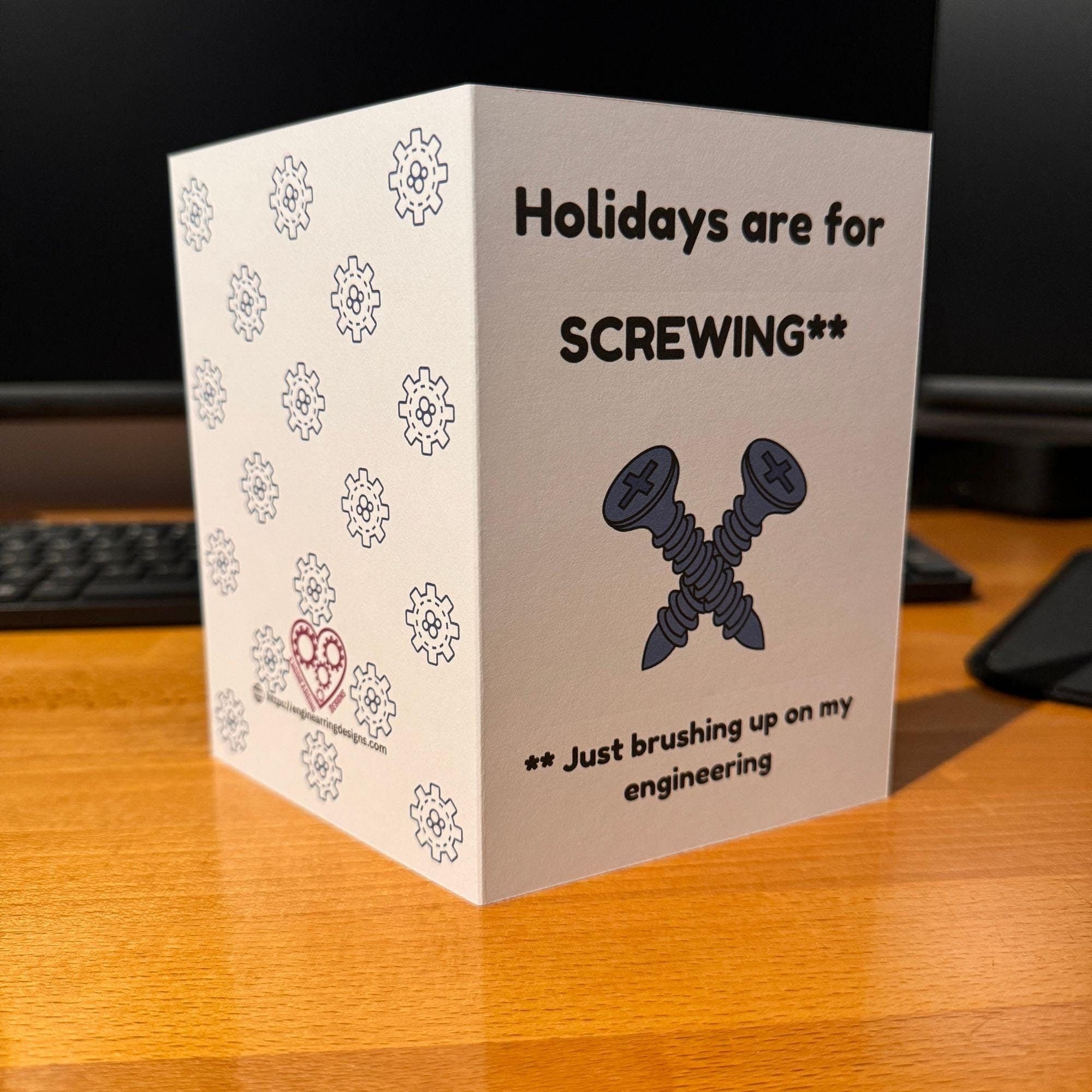 The card features two screws with the caption "Holiday are for Screwing** just brushing up on my engineering". The card is blank inside for your own message.