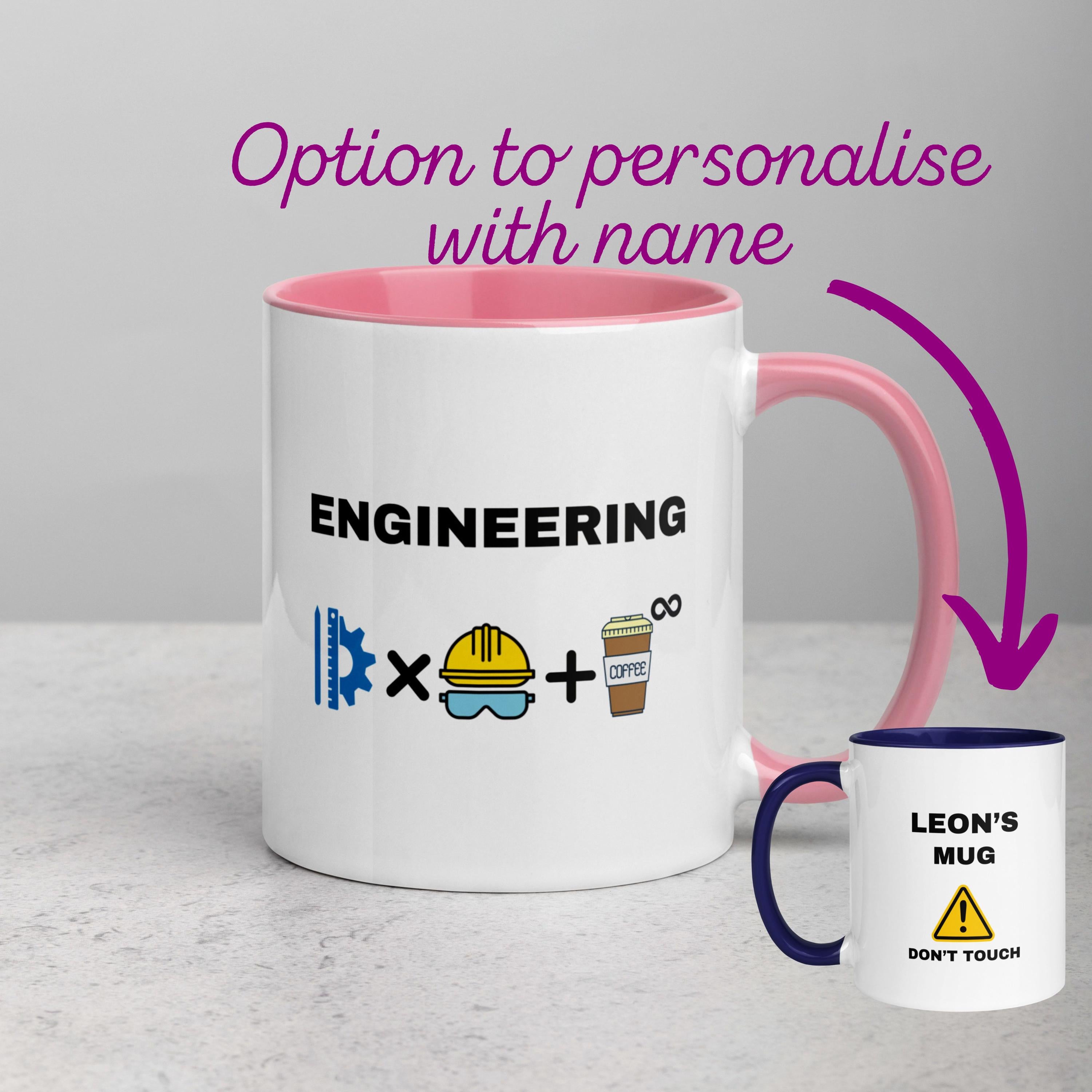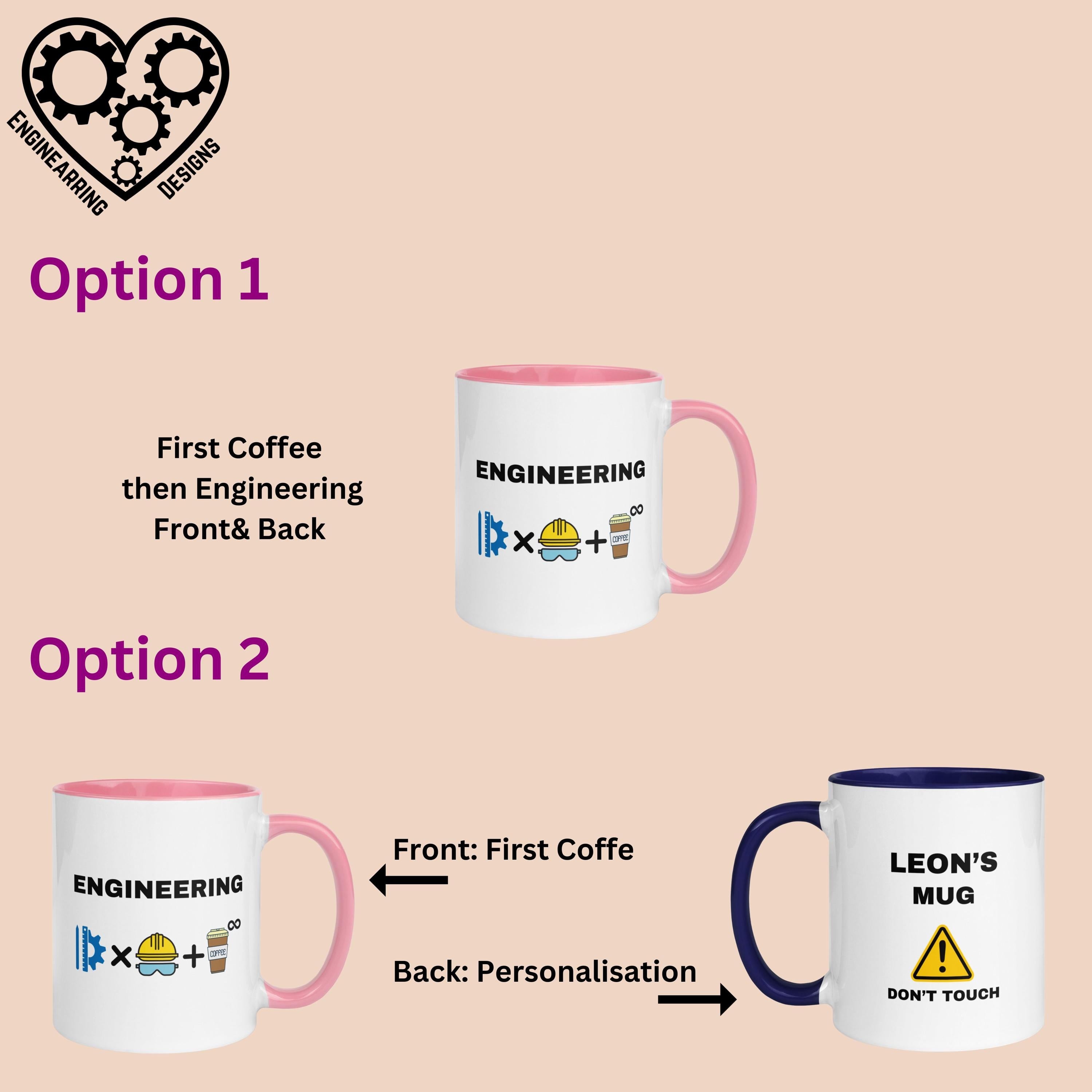 Funny Personalised Engineer Mug with Colour Handle and Inside. Engineering is Innovation, hard work and infinite cups of coffee. Custom Mug