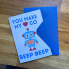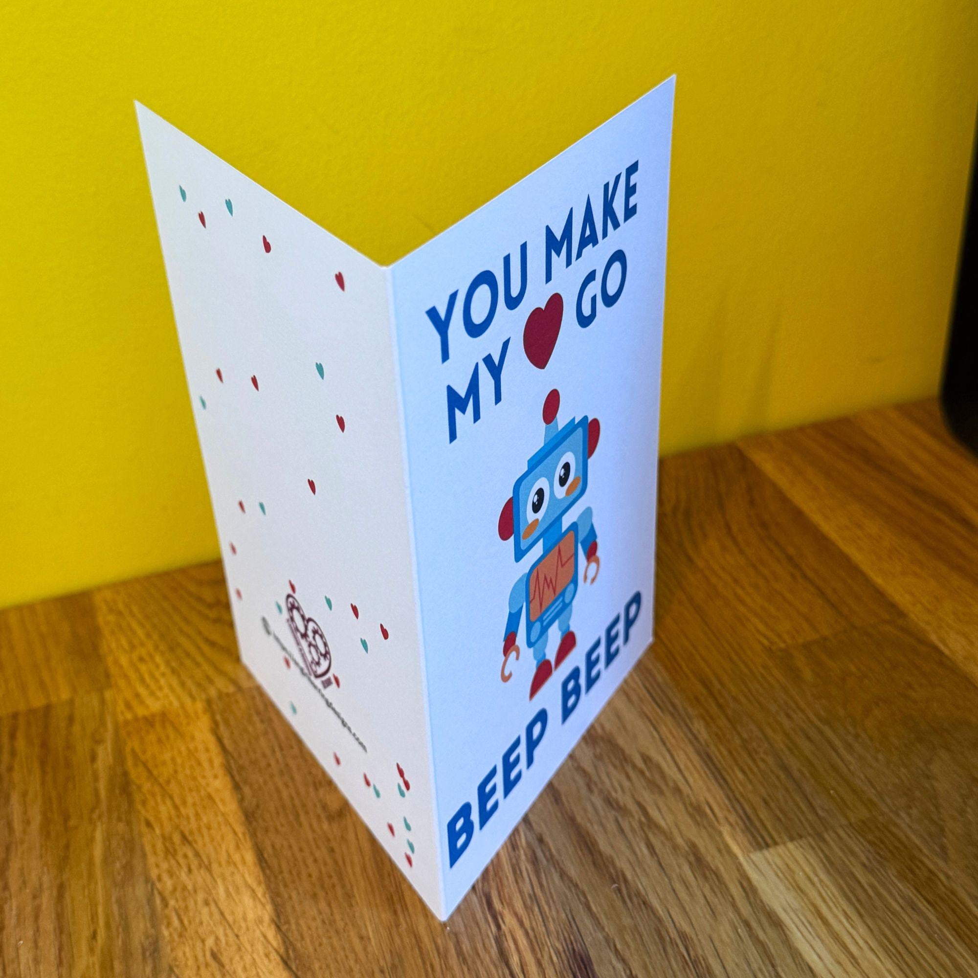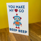 The card features a cute robot with the words "You Make My Heart Go Beep Beep". The card is blank inside for your own message.
